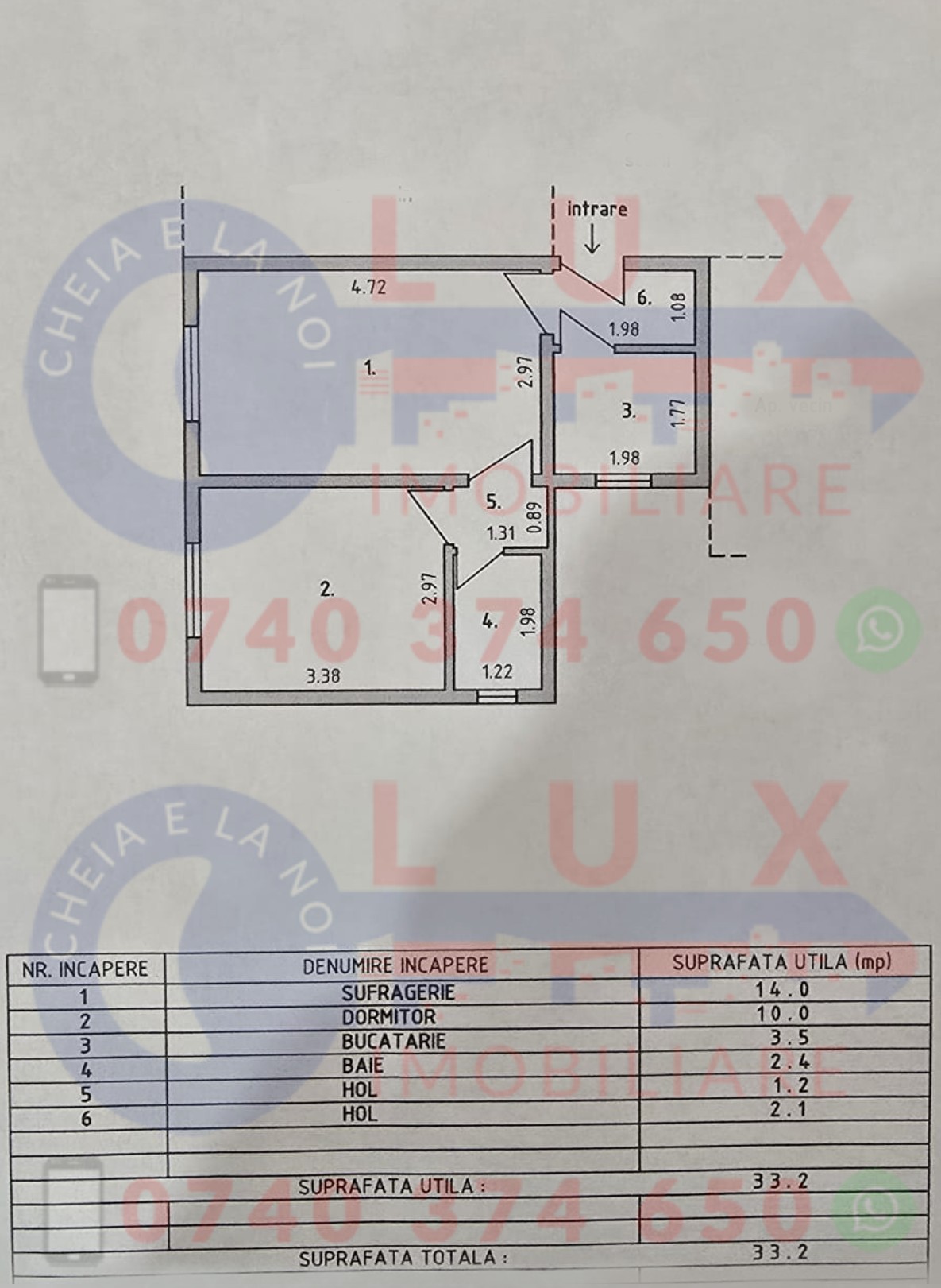 Proprietatea are suprafata de 33,2 mp si este compartimentata astfel: bucatarie, hol, living, dormitor si grup sanitar.
