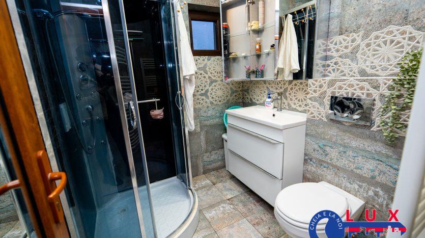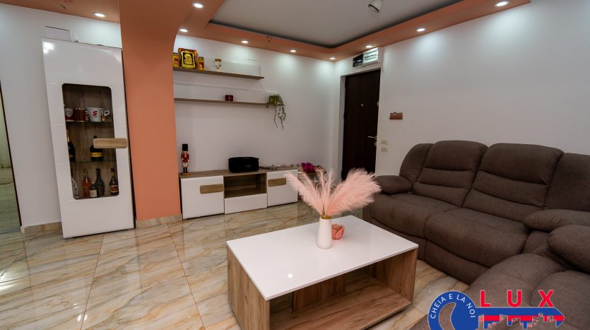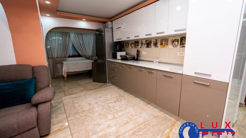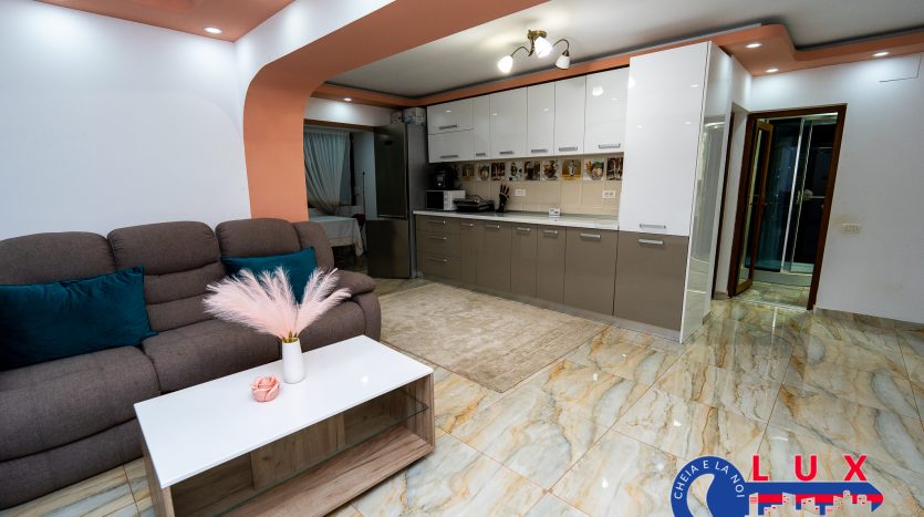 Această proprietate impresionează printr-un living generos de tip open-space, extrem de luminos, integrat cu o bucătărie modernă, mobilată și utilată, unde zona de gătit (aragazul) a fost mutată pe balcon pentru a eficientiza spațiul. Apartamentul dispune de două dormitoare confortabile, cel principal beneficiind de propriul grup sanitar, la care se adaugă o a doua baie modernă, dotată cu cabină de duș.