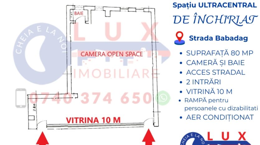 Agenția LUX Imobiliare vă oferă oportunitatea închirierii unui spațiu situat ULTRACENTRAL, pe Strada Babadag. Locația spațiului este una de excepție, aceasta fiind situată în inima orașului, aproape de Piața Civică si Faleza Dunării.